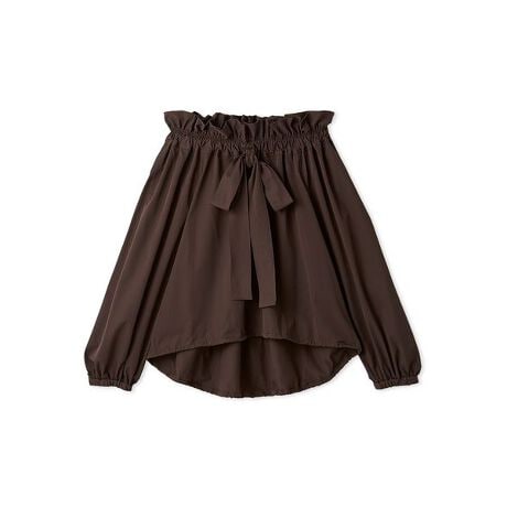 襟ぐりはゴム仕様で、オフショルとしてもワンショルとしても、またフリルカラーのブラウスとしても着用可能な3WAY。