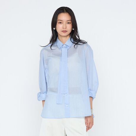 繊細で上品なストライプをマニッシュフェミニンな雰囲気に仕上げた、シアーストライプのボウタイシャツです。