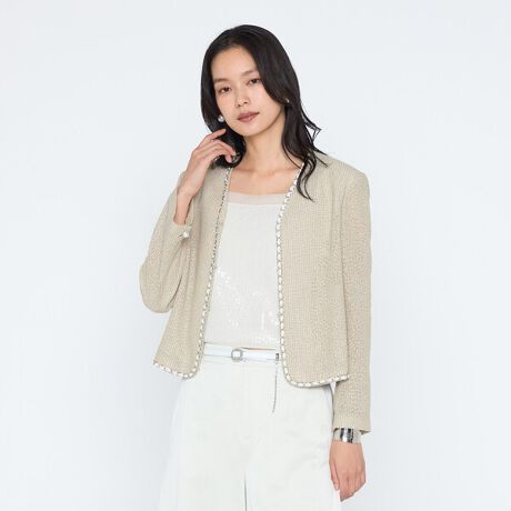 ファンシーツイードの表情はそのままに、薄く軽やかに仕立てたカラミツイードのノーカラージャケットです。