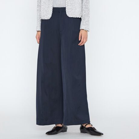 ウエストからヒップにかけてダーツですっきりと仕上げ、脇にサイドタックを入れてワイドパンツのボリューム感をコントロールし、シャープでエレガントなシルエットです。