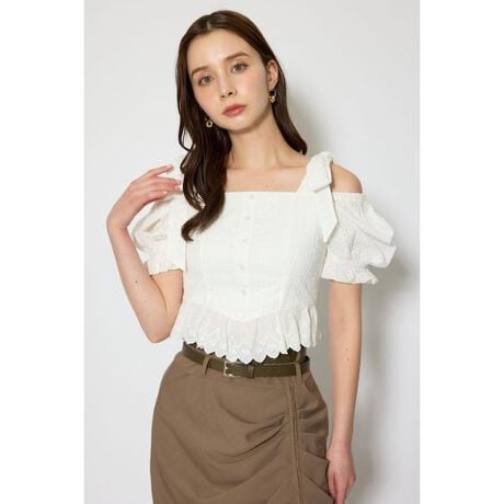 【この春着たい!レディ要素いっぱいのコットンレースブラウス】■ポイント細かい刺繍がほどこされたコットンレースを使用したブラウスです。ボリュームある袖は気になる二の腕をカバーしてくれます。■ディテール肩のリボンやパフスリーブ、ウエストのVラインなどレディ要素とこだわりあるディテールが豊富なブラウスに仕上げました。スリーブ部分はオフショルをメインで着ていただくのがおすすめですが、肌の露出が気になる方はセットインでも着用していただけます。■スタイリングコンパクトなサイズ感なので、ハイウエストのボトムとのスタイリングがおすすめです◎■生地透け感:なし裏 地:身頃:あり、袖:なし伸縮性:なし光沢感:なし厚 さ:薄手■商品のお気に入り登録お気に入りアイテムの再入荷・在庫1点などの通知を受け取ることができます。[注意事項]※画像の商品はサンプルです。実際の商品と仕様、加工が若干異なる場合があります。※画像の商品は光の照射や角度、お使いのモニター環境により、実物と色味が異なる場合がございます。※着用、お取り扱いの際は、アテンションタグをご確認ください。