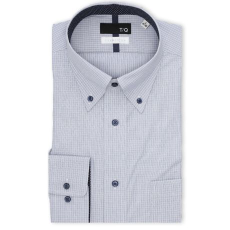 清潔感のある細かいグラフチェック柄です。衿型はアンタイド(ノーネクタイ)でも衿立ちよく収まり、オフィスカジュアルにもぴったりなボタンダウンを採用しています。衿腰内・カフス裏の別生地と、ヨーク内側・下前立のデザインテープがアクセントになっています。