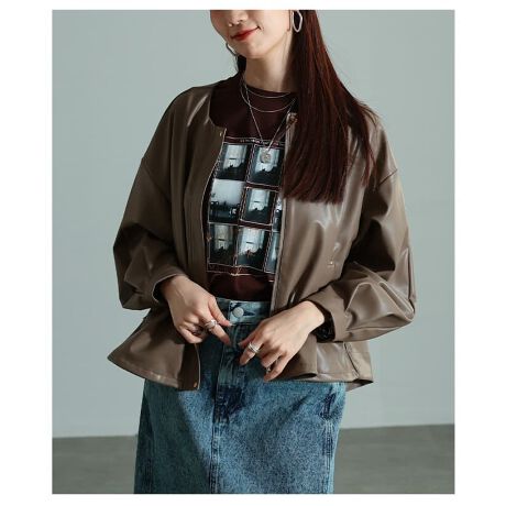 ノーカラーで首元をすっきり見せてくれるフェイクレザージャケット。後ろ下がりのシルエットが動きを生み、さっと羽織るだけでこなれた印象に。ハードすぎず、大人のスタイルに取り入れやすい一着です☆