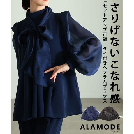 タイ付きデザインが目を惹くペプラムブラウス。ふんわり広がるシルエットで女性らしいメリハリを演出します。「almam-203124」のパンツと合わせれば、きちんと感のあるセットアップスタイルも楽しめる一枚です☆