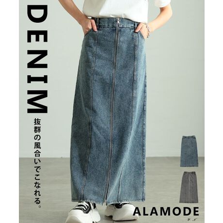 ウォッシュ加工で表情を出したロング丈のデニムスカート。フロントジップがさりげないアクセントになり、すとんと落ちるストレートラインで縦のラインを強調します。カジュアルにもきれいめにも合わせやすい、頼れる一枚です☆