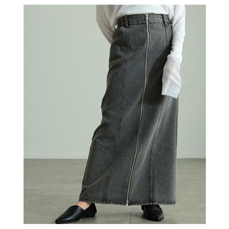 ウォッシュ加工で表情を出したロング丈のデニムスカート。フロントジップがさりげないアクセントになり、すとんと落ちるストレートラインで縦のラインを強調します。カジュアルにもきれいめにも合わせやすい、頼れる一枚です☆