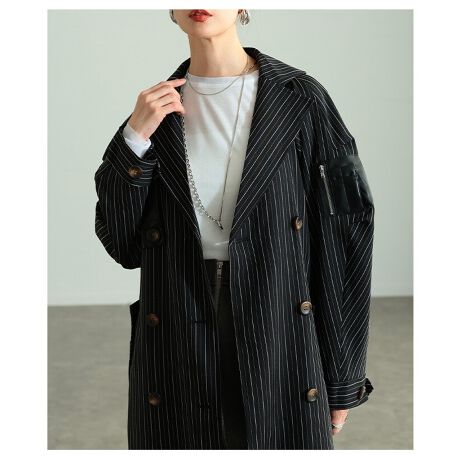 レザー使いがさりげなく効いたトレンチコート。ピンストライプが縦ラインを強調し、すっきりとした印象に仕上げます。羽織るだけでコーデが引き締まる、洗練された一着です☆