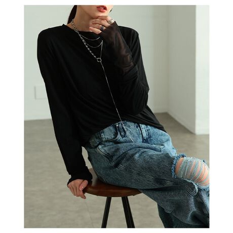 まるでチュールトップスを重ねているかのようなデザインのロンT。一枚でスタイルが完成し、頑張りすぎないおしゃれが楽しめます。ほどよい透け感が抜けを生み、コーデに軽やかさをプラスしてくれる一着です☆