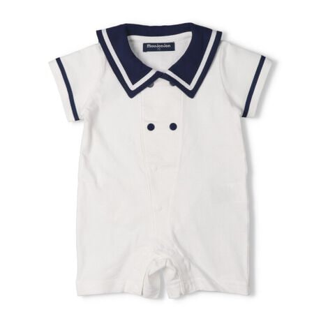 セーラーカラー、セーラー衿デザインがマリンテイストで夏らしい!前開きデザインの半袖ロンパース、Tオール。同じデザインのTシャツ(M36500)があるので、兄弟でお揃い、ペアコーデ、リンクコーデもおすすめ!おそろいアイテムはギフトやプレゼントにも人気です!【アイテム】プレゼント ギフト 赤ちゃん服 ベビー服 贈り物 トップス ボトムス つなぎ カジュアル お洒落 オシャレ かわいい 可愛い 普段着 デイリーウェア お出かけ着 ロンパース Tオール 子ども こども 男児 男の子 ボーイズ キッズ ベビーサイズ 幼稚園 保育園通園 2026年春夏物新作 丸高衣料 ホワイト 白色 ネイビー 紺色 ムージョンジョン 兄弟 お揃い オソロ おそろい お揃いリンク リンクコーデ ペアルック  コットン100% 綿100%