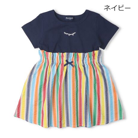 ポコポコと凹凸感のある夏らしいサッカー素材の先染めストライプ柄のスカートとTシャツ、天竺素材の異素材切替デザインの半袖ワンピース。ウエストの小さなリボンのモチーフもポイント!同じストライプ柄のハーフパンツ(M35103)もあるので、兄弟姉妹やお友達と男女でアイテム違いでペア、リンクコーデ、お揃い、おそろいコーディネートも楽しめます!【アイテム】トップス シンプル ガーリー フェミニン カジュアル お洒落 オシャレ かわいい 可愛い 普段着 デイリーウェア お出かけ着 お外着 お外遊び着 子ども こども 女児 女の子 ガールズ キッズ ベビーサイズ トドラーサイズ 幼稚園 保育園 小学校 通園 通学 小学生 2026年春夏物新作 丸高衣料 ホワイト 白色 ネイビー 紺色 ロゴ りぼん カラフル レインボー コットン100% 綿100% ムージョンジョン