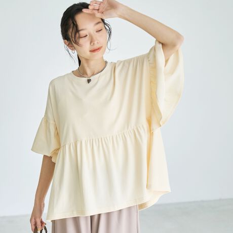 ギャザーの効いたふんわりシルエットは、シンプルなデニムと合わせるだけでバランスよく決まります。