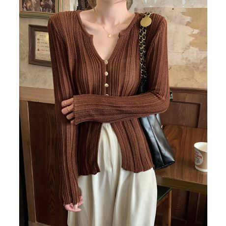 透かし編みVネックニット フロントボタン