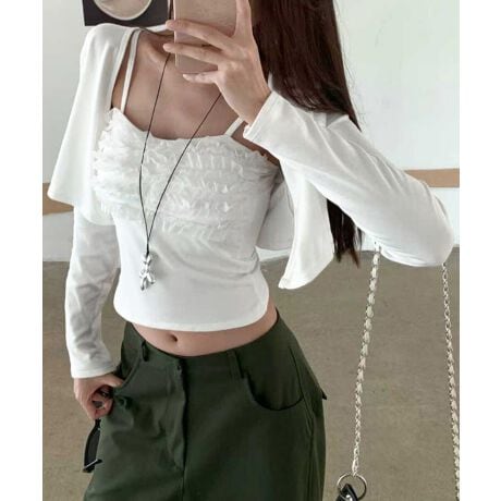 フリルが可愛いキャミソールとショート丈カーディガンのセット。