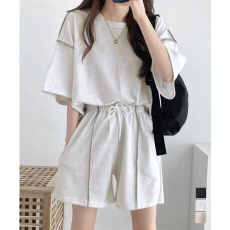 ベーシックな半袖Tシャツとウエストゴムショートパンツのセットアップ。