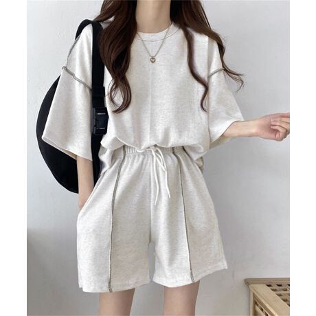 ベーシックな半袖Tシャツとウエストゴムショートパンツのセットアップ。