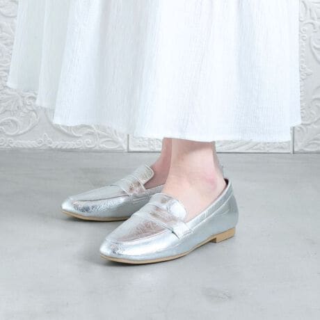 すっきりとした細身シルエットが魅力の、ミニマルなフラットローファーです。メタリックカラーには上品な光沢素材を、ベーシックカラーにはなめらかなスムース素材を採用し、カラーごとに異なる表情を楽しめるデザインに。フラット仕様で歩きやすく、デイリーからお出かけまで幅広く活躍します。気負わず履けて、自然と出番が増える一足です。