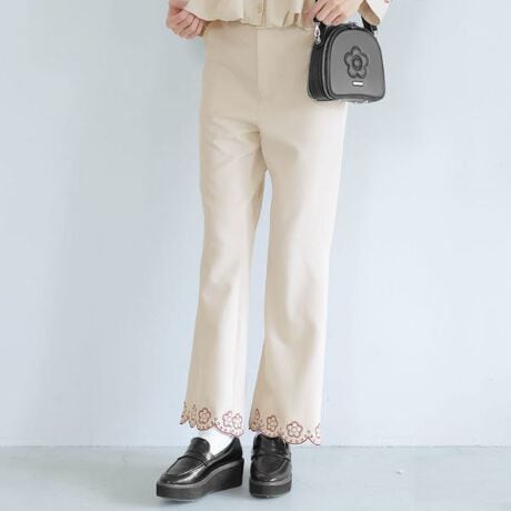裾のスカラップデザインが上品で甘い雰囲気を演出するセミフレアパンツ。