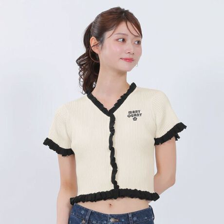 配色のフリルが目を引くニット・カーディガン。◆ポイント・左胸にレトロロゴ刺繍・配色のフリル・伸縮性のあるリブ生地・クロップド丈・Vネックの半袖◆コーディネートパンツと合わせれば、甘すぎないコーデに。[型番:226-701902]
