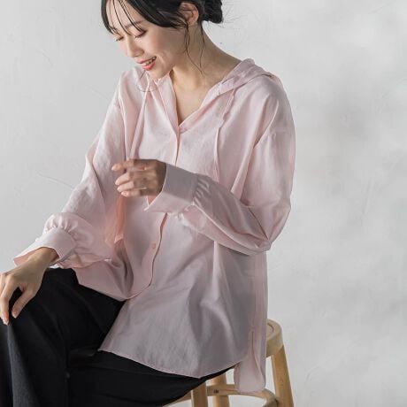 デザイン/一枚着でも羽織としても使用できるフード付きシャツ。