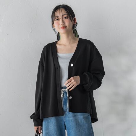 異素材のコントラストが、Vネックのすっきりシルエットを引き立てます。