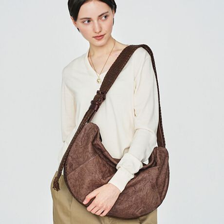 手絞りによるシワ加工を施した表情豊かな革と、繊細に編み込まれたメッシュを組み合わせた、深みと軽やかさを併せ持つ、春夏に相応しいカジュアルバッグ。