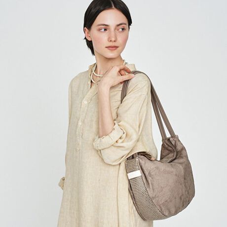 手絞りによるシワ加工を施した表情豊かな革と、繊細に編み込まれたメッシュを組み合わせた、深みと軽やかさを併せ持つ、春夏に相応しいカジュアルバッグ。