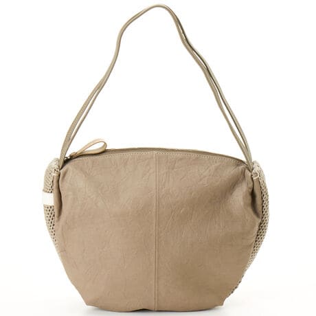 手絞りによるシワ加工を施した表情豊かな革と、繊細に編み込まれたメッシュを組み合わせた、深みと軽やかさを併せ持つ、春夏に相応しいカジュアルバッグ。