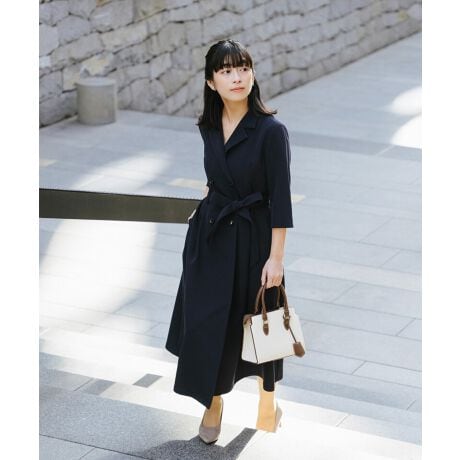 テーラードでダブルブレストなデザインが上品で美しい7分袖ワンピース。