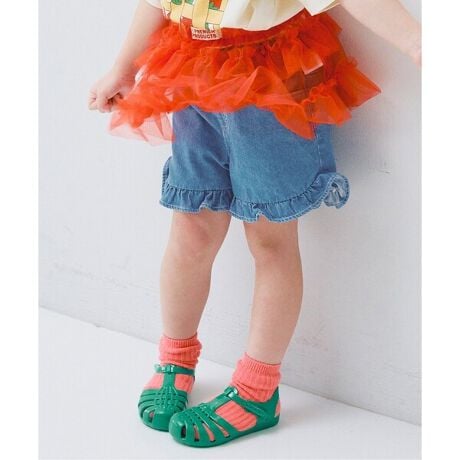 ラウンドカットの裾とフリルをあしらったショートパンツ。