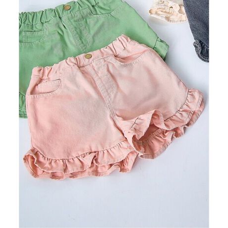 ラウンドカットの裾とフリルをあしらったショートパンツ。