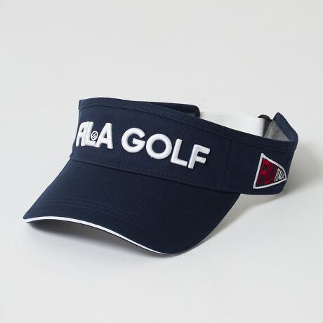 [型番:81791030]ツイル素材を使用したサンバイザー。ツバが柔らか仕様なので締め付けにくく、かぶり心地が良いです。FILAGOLF3D刺繍とフラッグ刺繍が入ります。【744920 NV】