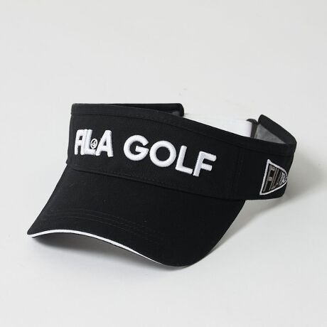 [型番:81791022]ツイル素材を使用したサンバイザー。ツバが柔らか仕様なので締め付けにくく、かぶり心地が良いです。FILAGOLF3D刺繍とフラッグ刺繍が入ります。【744920 BK】