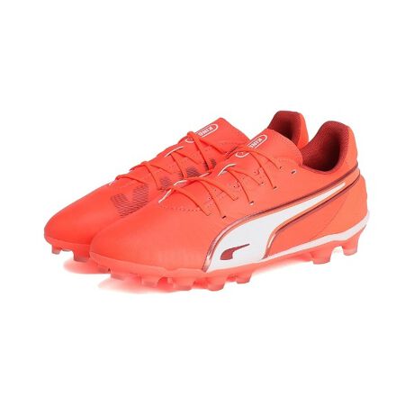 \n 商品情報\n固い土、人工芝用\n\n\n新しいキングは、とても柔らかい合成アッパーと軽量のTPUアウトソールが融合し、比類のない敏捷性を実現します。レギュラータン構造はさまざまな足の形に適応し、EVAミッドソールはクッション性のあるサポートを提供。固い土や人工芝のグラウンドに最適な一足です。\n\n 特徴 \n\nスーパーソフト マイクロファイバー アッパー: とても柔らかいマイクロファイバーをアッパーに採用。?手触り、快適性、耐伸縮性が従来の人工皮革よりも大幅に アップしており、ソフトなフィット感と耐久性を高めている。?素材はリサイクル素材を使用しており、プーマブランドのコン セプトであるサステイナブル/地球環境への影響軽減を実現 した新しいマテリアルアッパー。?\nHG DULABILITY アウトソール?: 日本でプレーをする全てのプレーヤーの為に開発をされた HGソール。耐久性に優れるポリウレタンからなるアウトソール。台形のスタッドベースメントで安定性と強度をもたらします。スタッドの地面接地面に凹凸をつけることで滑りを軽減することで、人工芝、土、天然芝での使用を可能にしたアウトソール\nリサイクル素材使用:より良い未来への一歩として、アッパー部分に20以上のリサイクル素材を使用しています。\n\n 詳細 \n\nとても柔らかい合成繊維のアッパー素材\nシューレース式\n着脱のしやすさとフィッテイングを調整可能なクラシックコンストラクション構造 \nEVAミッドソールを備えた軽量でありながら耐久性のあるTPUアウトソール\nHG: 固い土や人工芝での使用に適しています\nPUMA Youth:8才以上のお子様にお勧めのサイズ\n