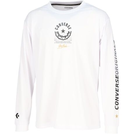 CONVERSEロゴとバスケットリングのフォトを組合わせたグラフィック。シンプルで大人っぽいデザイン。左袖にもロゴプリントが入っているのもポイントの1枚。