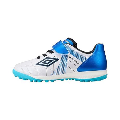 『ACCERATOR』シリーズのスタータープレーヤー向けシューズ。日本国内企画のワイドラスト。アンブロが持つフィッテイングサポートファンクションのAフレームをグラッフィクデザインで表現。インステップキック時のインパクトを意識しやすいプリント加工を採用。104本のラバースタッドでグリップし、屈曲性を考慮したアウトソールを採用。Aフレームプリントデザインを採用。耐久性に考慮した着脱が容易な1本ベルト仕様。アッパー材全体に耐久性のある合成皮革を採用。クッション性と反発性を考慮したインジェクションEVAをミッドソールに採用。取り外し可能なEVAカップインソール。約155g(19.0cmで計測)