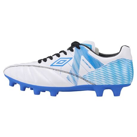 『ACCERATOR』シリーズの合成皮革アッパーシューズ。フットボールの激しい動きの中でパフォーマンスを発揮することをコンセプトにラスト開発を実施。アンブロが持つフィッテイングサポートファンクションのAフレームをグラッフィクデザインで表現。インステップキック時のインパクトを意識しやすいプリント加工を採用。プレー時の安定感向上を目指し、指が動かしやすい前足の適度な幅と、かかと回りの立体形状にこだわり設計。ラスト設計を活かせるような中足部のパターン構造やシューホールデザインを採用。かかと周辺は自然な収まりを目指して材料選択を実施。人工芝、天然芝、ハードグランド対応のアウトソールはパフォーマンスアップを目指し、刺さりと抜け易さを目指した設計を採用。約250g(27.0cmで計測)