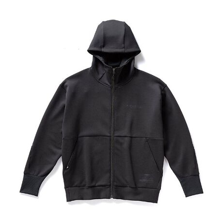 柔らかく、滑らかで肌触りの良い生地をチョイス。オフショルダーにしたリラックスシルエット。袖先やフードの内側にテクスチャーのある生地を採用し、ステッチパターンに拘ることでテクニカルな雰囲気を共存させる。左胸のロゴと裾のシュータンデザインはエンボスで加工。