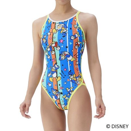 耐久性に優れた TOUGHSUIT(タフスーツ)シリーズの Disney(ディズニー)デザインモデル。環境に配慮したリサイクルポリエステル素材を使用しており、塩素に強く長持ちするため、大会に向けて練習を重ねる頻度が高いスイマーにおすすめのトレーニング(練習)用水着。様々な表情やポーズをしたドナルド・ダックとその甥っ子たちヒューイ・デューイ・ルーイが描かれたプリントデザイン。カラフルなストライプ柄に星や記号が描かれたポップで可愛いデザインでトレーニング中の気分もアップ。水着とデザイン連動のメッシュキャップ(AS5FSC81U)やプルーフバッグ(AS5FBZ84U)とのコーディネートもおすすめ。※、この製品は縫製上、一点一点プリント柄の見え方に違いが生じますので予めご了承ください。