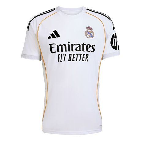 チームの礎。ベルナベウスタジアムの改築工事を記念する、レアル・マドリードのホームユニフォーム。数々の栄光を築いてきた過去のユニフォームへのオマージュを込めて、それらの配色、風合い、シェイプを採用している。25/26シーズンに伝説的ホームスタジアムで選手が着用するためにデザインされたこのユニフォームには、選手の身体を快適にサポートする、優れた吸湿性を発揮するAEROREADYを使用。クラブのプライドを示す刺しゅうエンブレム入り。
