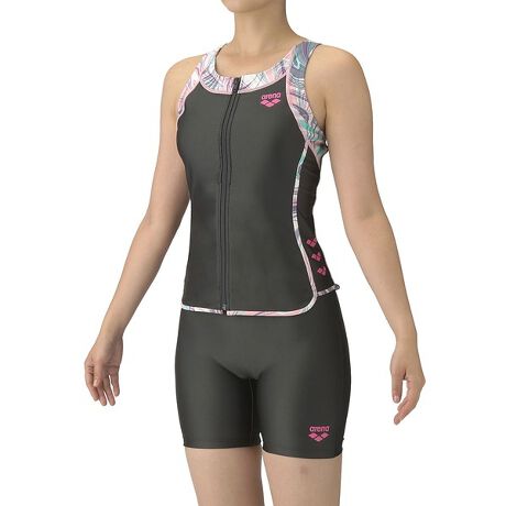 アクアビクスや水中ウォーキングなど、健康やリフレッシュのためにプールでエクササイズを「おしゃれに楽しみたい」フィットネススイマーにおすすめのフィットネス水着。上下が分かれたセパレーツ水着で、大きく開いて着脱がしやすい「着やストラップ」搭載。ファスナー付きのため、更に着脱が簡単。ハイウエストパンツで、気になるお腹・腰回りをしっかりカバー(※ウエスト紐は付いておりません)。2段階で調整可能な大きめカラースナップがトップスとボトムスをつなぎとめてくれるため、水中でもめくれ上がりにくい。パッドは、「差し込みパッド」を使用しており取り外しが可能。また、パッドポケット内に収まるため、脱ぎ着がしやすく、水の中でもしっかりフィットし、安心感のある仕様。胸元のアリーナロゴと脇のアリーナウロコプリントに加えて、パイピングデザインがアクセントとなり、シンプル・スポーティーに仕上げたアリーナらしいデザイン。「プールに通ってみようかな」と検討している方にぜひおすすめしたい一枚。