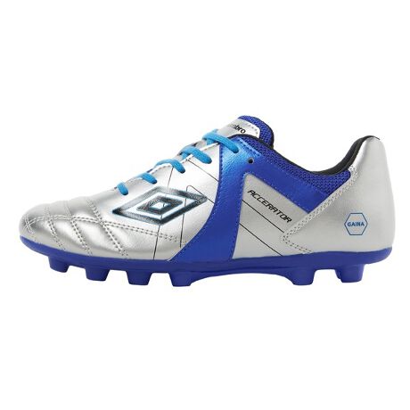 『ACCERATOR』シリーズのスタータープレーヤー向けシューズ。日本国内企画のワイドラスト。アンブロが持つフィッティングサポートファンクションのAフレームをグラフィックデザインで表現。インステップキック時のインパクトを意識しやすいプリント加工を採用。アッパー材全体に耐久性のある合成皮革を採用。前足部には伸び過ぎを抑制するステッチをしっかりと配置。ジュニア世代の足の事を考えたラバー製スパイクソール。Aフレームパーツを採用。地面からの突き上げを感じやすい踵部分に衝撃緩衝材『U/メモリーF』を搭載。遮熱塗装材のGAINAをシューズ中底に搭載することで外部からの足裏への熱伝導を減らし、足裏のトラブルを軽減。取り外し可能なEVAカップインソール。約190g(22.0cmで計測)
