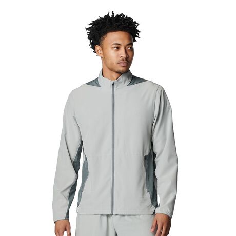 春先から初夏のワークアウトに最適なジャケット、前身頃、袖部分は撥水加工、サイドパネル、背面にパンチングメッシュの素材を使用し通気性を向上、ワークアウトによるオーバーヒートを防ぐ