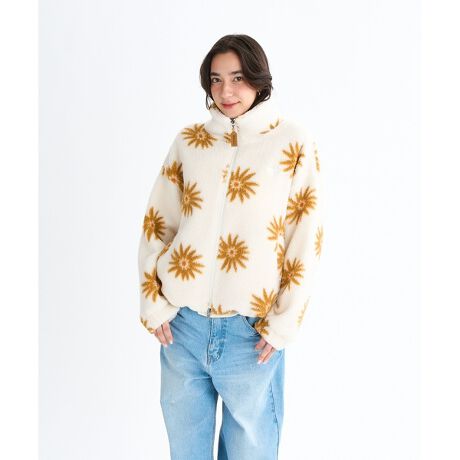 フラワー柄がアクセントになった、ショート丈のボアジャケット。中綿を入れ、裏地はキルトステッチで仕上げました。ダブルジップの仕様で、オリジナルのロゴ入りスライダーもポイントに。裾にはアジャスター付きのゴム仕様にしているので、シルエットの変化も楽しめます。胸元にはROXYハートの刺?を、左裾にはオリジナルのネームを叩きつけました。ショートパンツなどを合わせて、ヘルシーに着てほしい一着です。