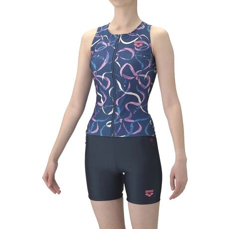 アクアビクスや水中ウォーキングなど、健康やリフレッシュのためにプールでのエクササイズを楽しむフィットネススイマーにおすすめのフィットネス水着。上下が分かれたセパレート水着で、ファスナー付きのため、着脱が簡単。背中の露出を抑えた「カバーバック」は安心感をお求めの方におすすめ。ファスナー付きのため、着脱が簡単。3段階で調整可能な大きめカラースナップがトップスとボトムスをつなぎとめてくれるため、水中でもめくれ上がりにくい。「差し込みパッド」は取り外し可能で、パッドポケット内に収まる設計。脱ぎ着がしやすく、水中でもしっかりフィットする安心感のある仕様。軽やかな動きのある流線とリボンをモチーフにしたプリントデザイン。華やかでエレガントな雰囲気がプールでの時間をいつもよりスペシャルに感じさせてくれるようなデザイン。※この製品は縫製上、一点一点プリントの柄の見え方に違いが生じますので予めご了承ください。