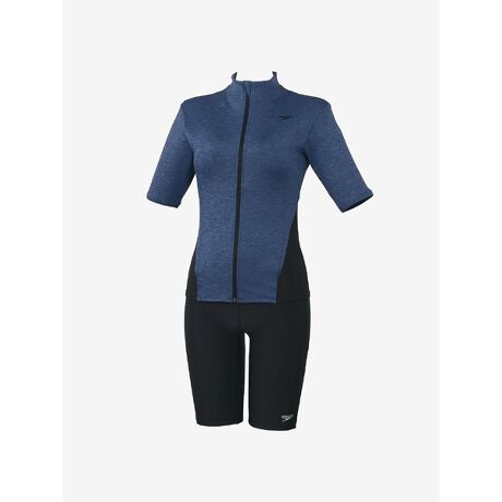 フィットネススイムウエアカテゴリー「Pool Athletics(プール・アスレティクス)」より、水中でのアクティビティを楽しむ方やはじめてプールでエクササイズを始める方におすすめのセパレートシリーズ。気になるパーツをスマートにカバーするレディースセパレーツ。トップスはソフトなストレッチ性とボディラインを拾いすぎないハリ感、軽量感が特徴の環境配慮型素材「Heather Stretch Pro(ヘザー・ストレッチ・プロ)」を採用。半袖タイプで気になる二の腕をカバー。フロントのウェービーライン&スタンドカラーにより、肩まわりはすっきりコンパクトな印象です。ウエストから裾にかけての切り替えデザインがウエストの位置を高くし、脚を長く見せます。背面中央の水抜け用メッシュ切り替えにより、水中での動きやすさを実現しました。差し込みタイプのカップ付きで、これ一枚で完結。着脱もカンタンです。ボトムスはトレーニング中も心地よくフィットしてズレにくい、環境配慮型素材「Ultra Stretch 0(ウルトラ・ストレッチ・ゼロ)」を採用。縦にも横にも自由に伸びる高いストレッチ性。はっ水機能つきで水中でのスムーズな動きをサポートします。膝上までの4分丈。トップスをめくれ上がりにくくするスナップ付きです。機能的でありながらボディラインを美しく見せるためのデザインにもこだわった、使い勝手の良い一着です。