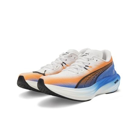 商品情報駅伝ランナーの「不安から自信へ」切り替えるスイッチを表現した EKIDEN PACK。その中でも「ウィメンズ ディヴィエイト ニトロ 3」は、PWRPLATEとNITROFOAMTMを搭載し、圧倒的な推進力と安定性を両立した万能モデルです。レースからペース走、ジョグまで幅広く対応し、ランナーの走りを次のレベルへ導きます。NITROFOAMTMは爆発的な速さを生み出す革新的フォームで、快適なクッション性を提供。さらに、PWRPLATEが着地の力を効率的に推進力へ変換し、エリート級の走行効率を実現します。アウトソールには耐久性とグリップ力に優れたPUMAGRIPを採用し、あらゆる路面で安定した走りをサポート。アッパーには通気性を考慮したエンジニアードメッシュを使用し、PWRTAPEで補強することでしっかりとしたフィット感を確保。さらに、フォームで補強されたロールカラー構造が快適さとホールド感を高めます。特徴・NITROFOAMELITE:トップレーシングモデルと同じ、高い反発性を提供するNITROELITEFOAM・NITROFOAM:爆発的な速さを提供する革新的なテクノロジー。NITROELITEFOAMと比較すると、安定性があり、脚への負担を軽減・PWRPLATE:パワフルな推進力とエリート級の効率性を実現・PUMAGRIP:PUMAGRIPアウトソールは耐久性のあるラバー製で、高いグリップ力を提供・エンジニアードメッシュアッパー:通気性を考慮して設計され、PWRTAPEで補強されたプレミアム素材が足へ快適なフィットを提供・ロールカラー:フォームで補強されたロールカラー構造により、快適さとフィット感を実現詳細・重量:約265g(27cm)・エンジニアードメッシュアッパー・かかと-つま先の高低差(ドロップ):10mm・プロネーションタイプ:ニュートラル・シリアス/ファンランナー向け・普段のランニングからマラソンまで対応・耐久距離目安:800km