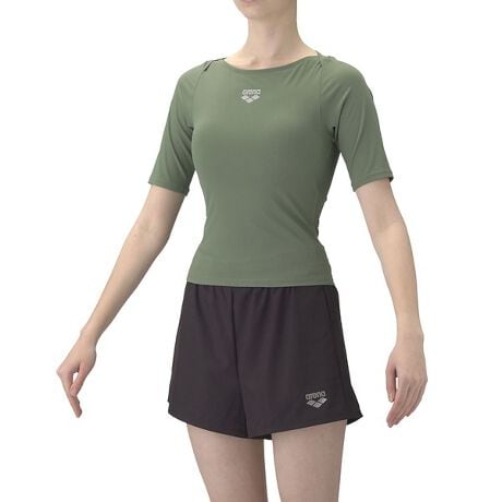 「これからプールに行ってみようかな?」や「プールでリフレッシュしたいな」と思っているユーザーにおすすめしたいフィットネスセパレート水着。トップスは、肌あたりのいいリブ素材を使用し、首回りはすっきりとした設計で、二の腕や脇をカバーしたい方におすすめの半袖タイプ。「差し込みパッド」は取り外し可能で、パッドポケット内に収まるため脱ぎ着がしやすく、水中でもしっかりフィットする安心感のある仕様。ボトムスは、ハリ感のある布帛素材を使用し、腰回り・太ももをゆるっとしたシルエットで自然にカバー。中にはインナースパッツが付いており、ウエスト紐で体型に合わせてサイズ調整も可能なため、水中でも安心感のある着心地。トップスとボトムスをつなぎとめてくれるスナップボタンが付いているため、水中でもめくれ上がりにくい。アリーナロゴをプリントしたシンプルなデザインが着用しやすく、手持ちのアイテムとも組み合わせやすい便利な一枚。お好みに合わせて選べる3カラー展開。