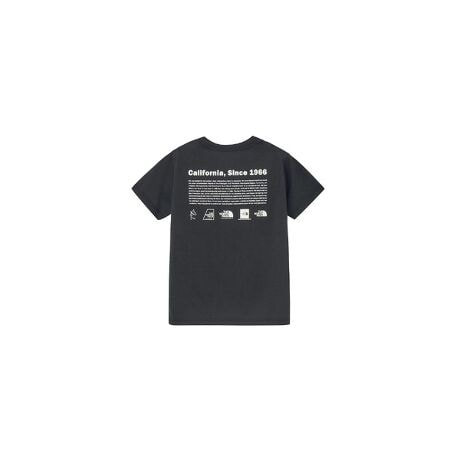 THE NORTH FACEの歴代のロゴを年代順に並べ、ブランドの歴史を記したグラフィックを背面に大きくあしらった半袖Tシャツ・やわらかくしなやかな肌触りのニット生地・親子でお揃いのコーディネートができる大人共通デザイン・リサイクルポリエステルとオーガニックコットンを混紡したニット・左胸にロゴプリント・ライフスタイル・アウトドア