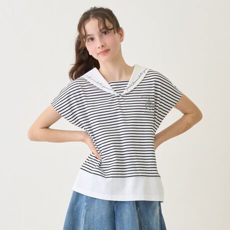 可愛らしさとさわやかな雰囲気を併せ持っているマリンテイストのセーラートップスです。
