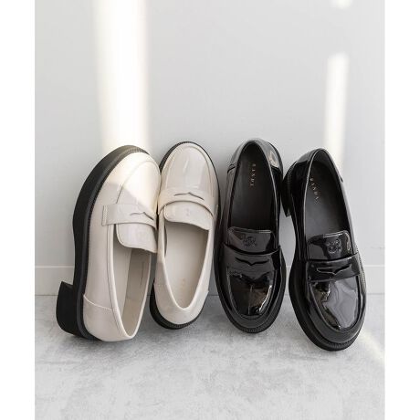 フロントにあしらったモノグラムエンボスがアクセントになるラウンドトゥローファー。